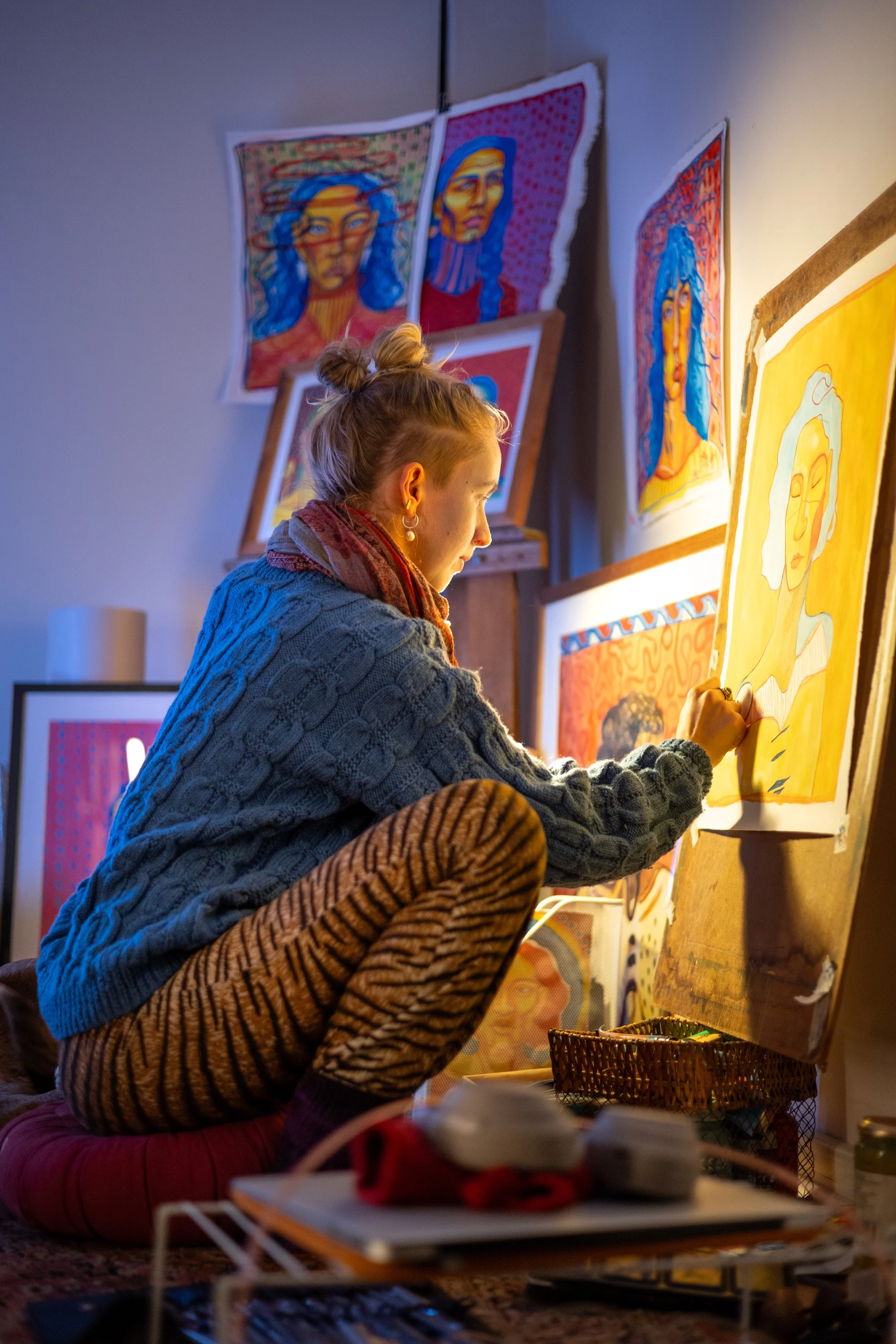 “Yeah my paintings have actually started to become quite personal. The other day I realised that I have been painting the protectors of different aspects of my inner being that have felt threatened over the past few years. Painting the protectors of these vulnerable parts of myself has made me stronger and braver to say something as simple as ‘no’. ”.